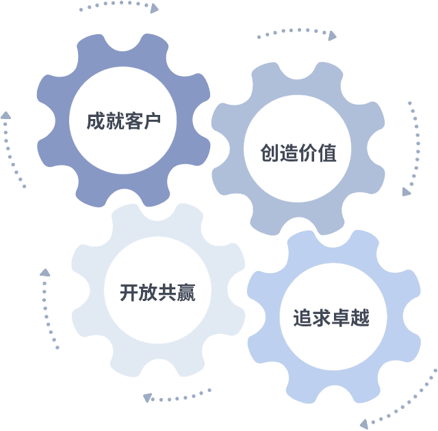 成就客户是一切决策的出发点,,,创造价值是衡量所有工作的标准,,追求卓越是我们做事做人的态度,,,开放共赢是我们的格局也是最终的结果。。。价值观的齿轮环环相扣,,,推动着组织里的每个人不断向前。。。。