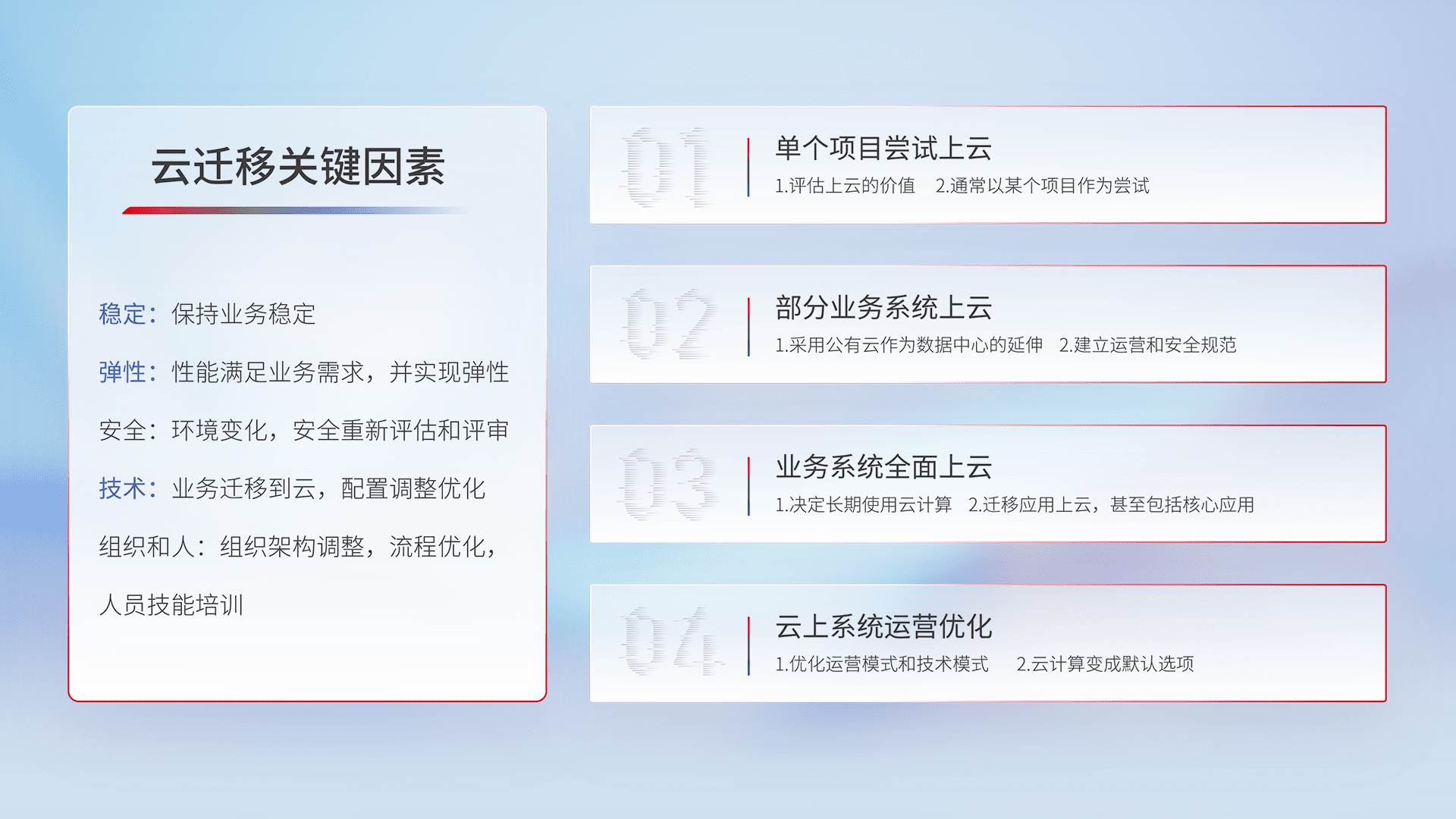 结合实际业务,,从规划设计、、、、云平台选型、、云原生改造、、、、数据迁移、、集成交付,,,,迁移全过程为客户识别最佳上云路径,,做好风险识别管理,,,,设计网络架构、、、、身份权限、、、、安全审计合规、、、操作审计、、日志审计、、、、监控告警策略、、多站点容灾设计等,,,,对云上基础设施进行整体规划,,,提升IT治理水平,,以满足弹性、、、高可用、、高性能的需求。。